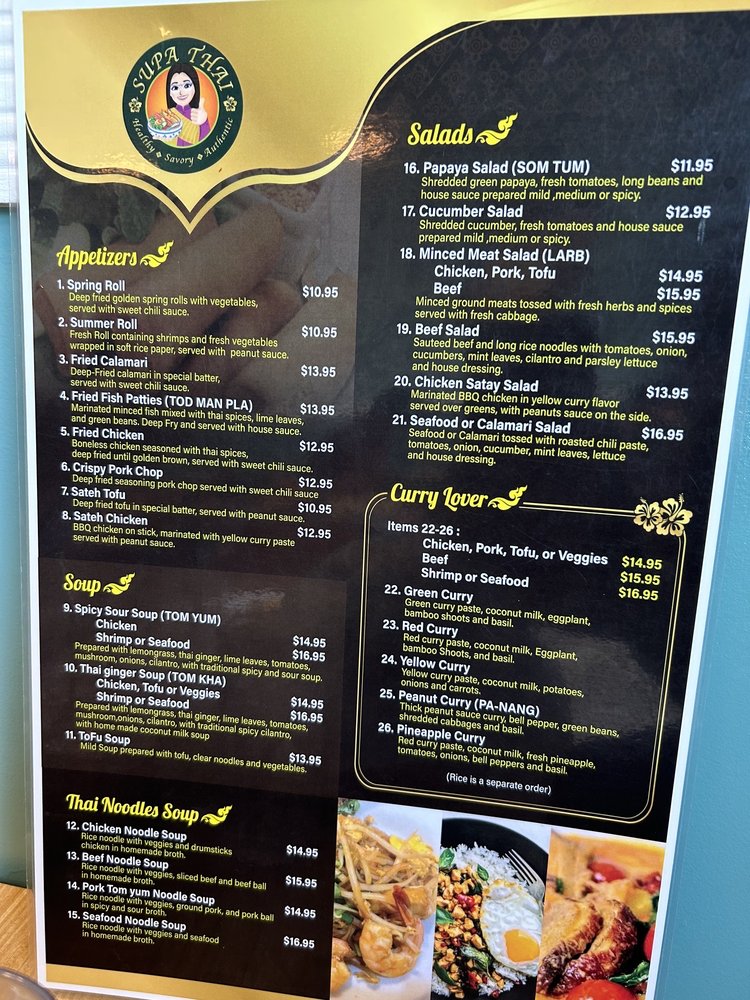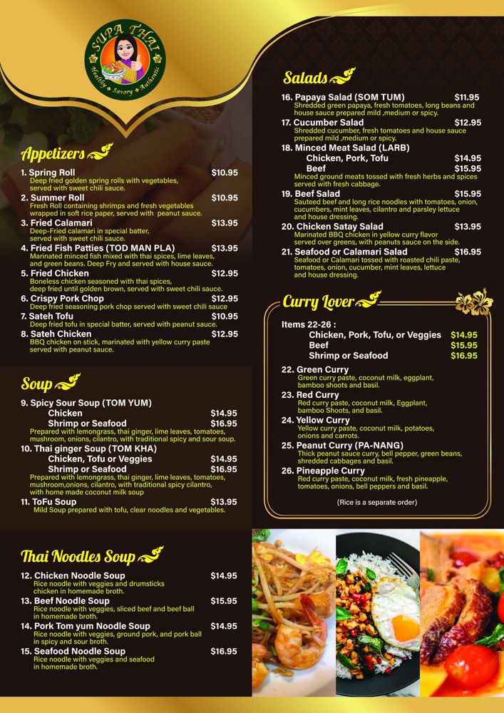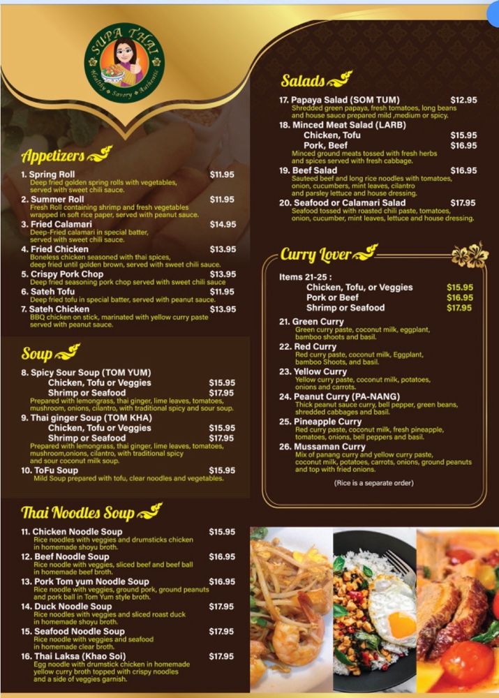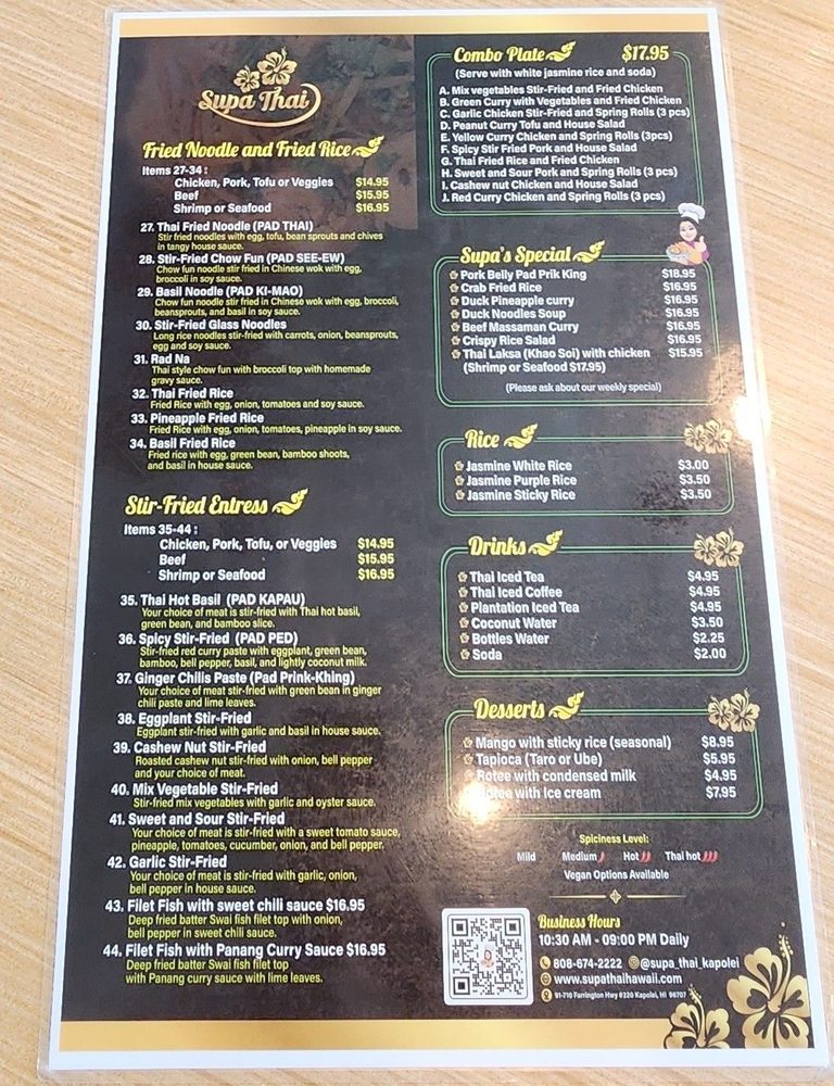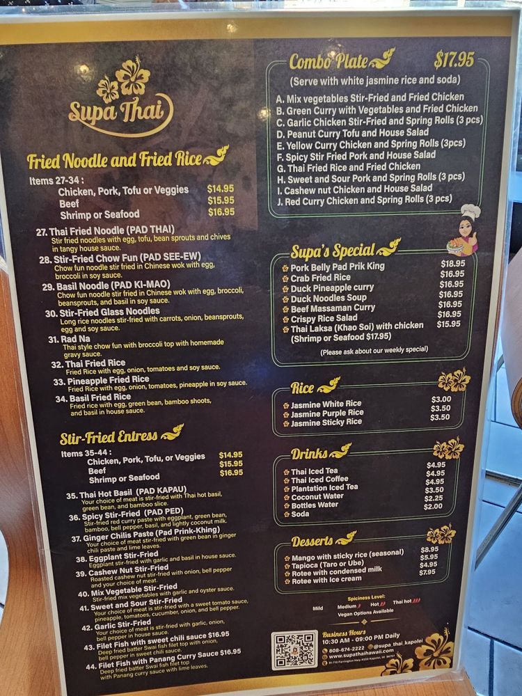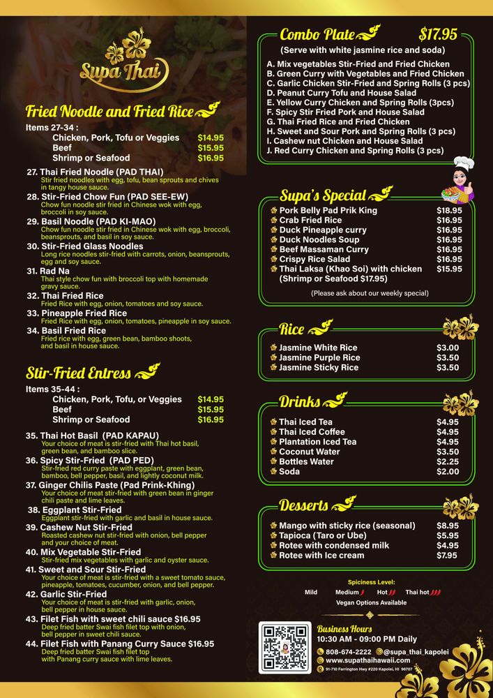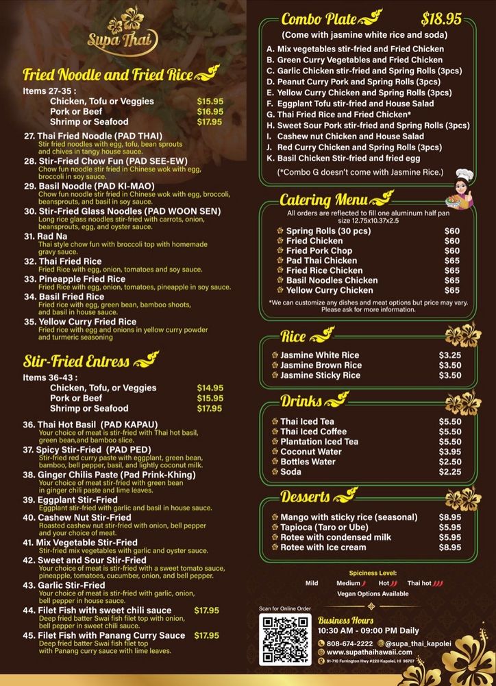 Supa Thai, located in Kapolei, HI, offers a delightful Thai cuisine experience with a focus on noodles soups, refreshing drinks, and appetizing starters. Customer reviews rave about the delicious dishes such as the papaya salad, fried chicken, and chicken pad thai, highlighting the perfect balance of flavors and textures. The menu also includes a variety of seafood dishes, curries, and refreshing coconut soup. Guests appreciate the friendly service, efficient delivery, and minimal wait times for their piping hot meals. The restaurant provides a clean atmosphere with ample parking and an option for outdoor seating. With options for vegan and gluten-free dishes, Supa Thai caters to a diverse range of dietary preferences. Overall, Supa Thai stands out for its flavorful Thai fare, making it a go-to spot on the west side for a satisfying meal experience.